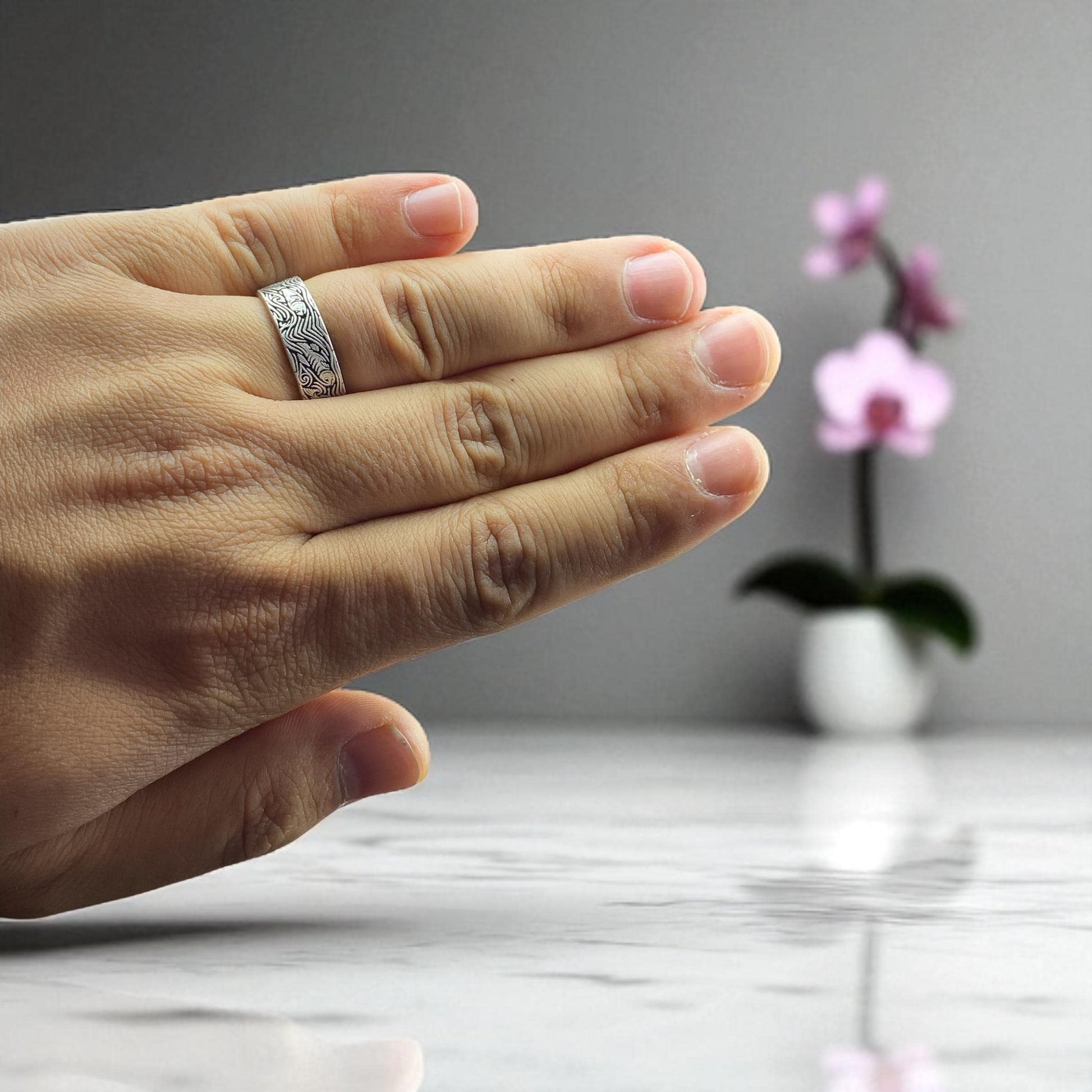 Handmade 925 Silver Engraved Ring – Artisan Botanical Pattern Band for Men – Vintage Style Nature Inspired Ring by Cousinjewellry