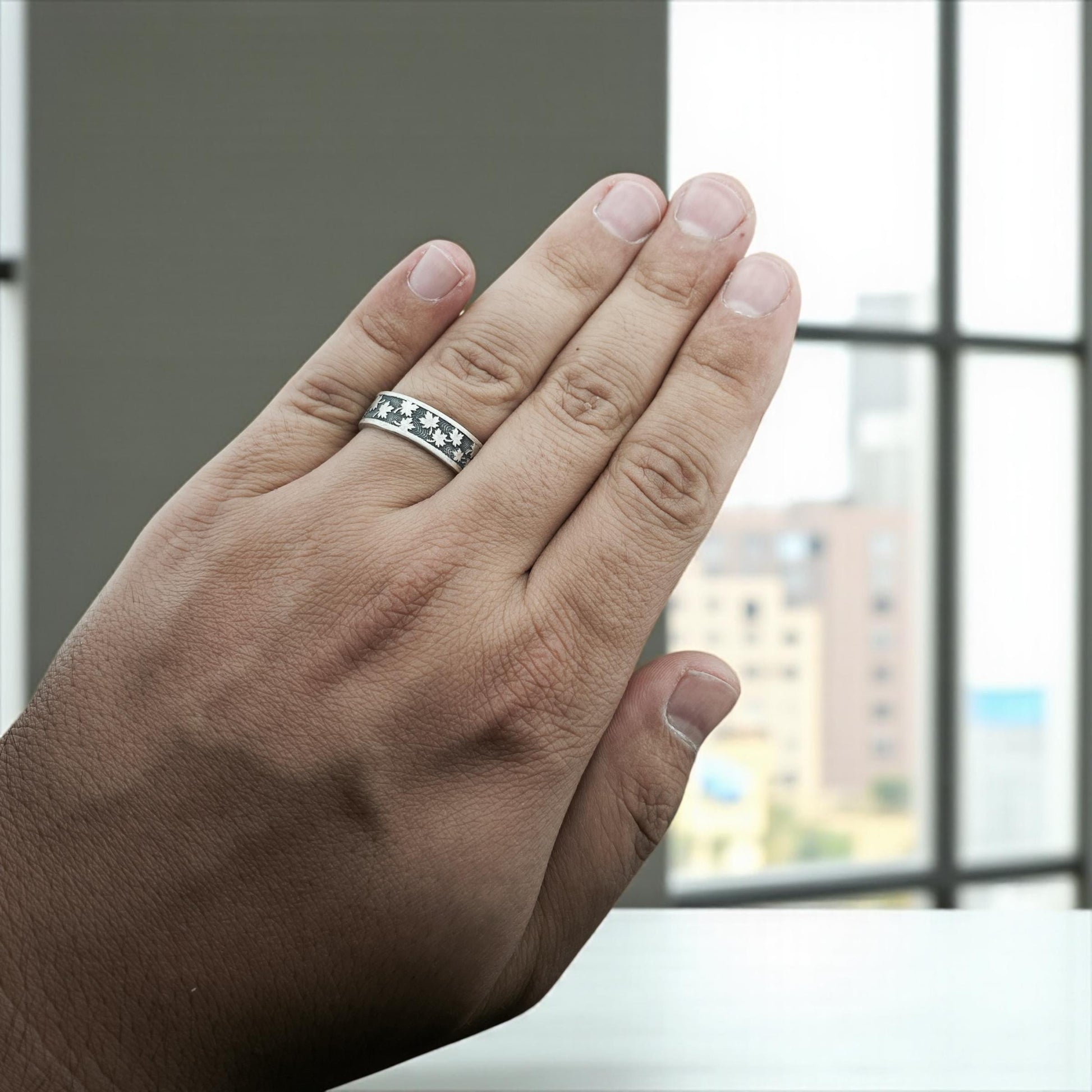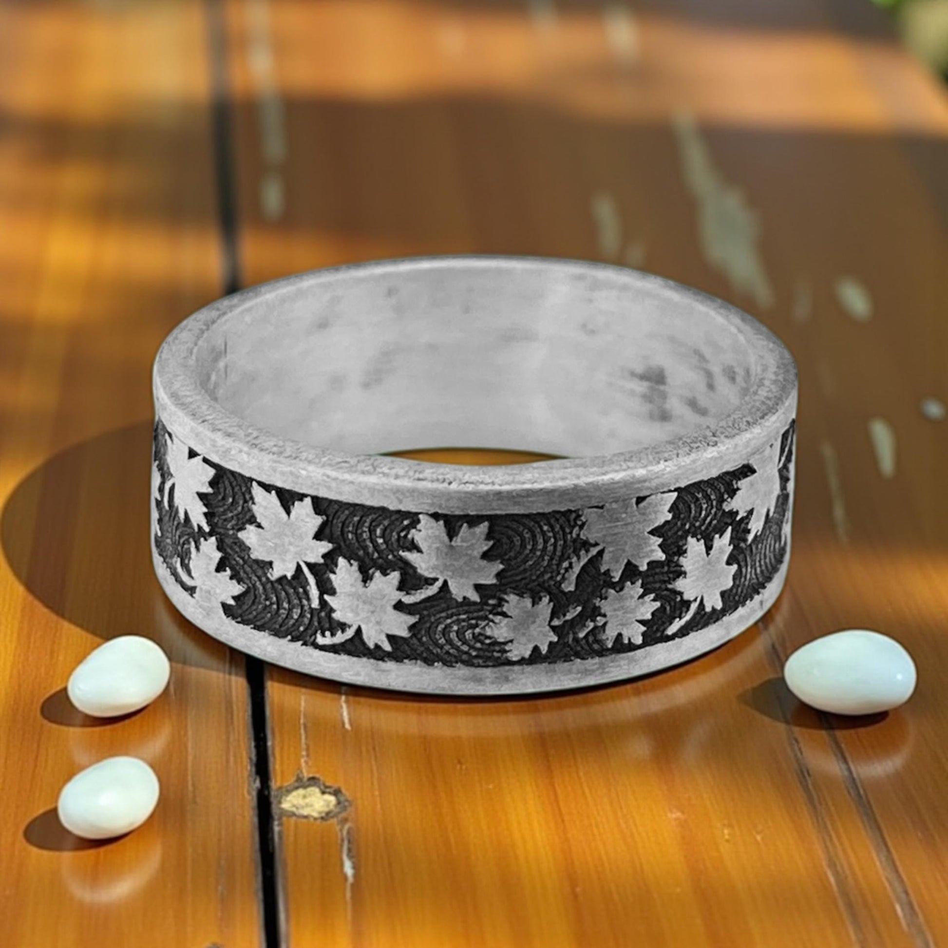 Step into the colors of fall with this hand-engraved maple leaf ring by Cousinjewellry. Crafted from solid 925 sterling silver, the 8 mm (0.31 in) band is carved with crisp Canadian maple leaves that dance over a rippling wood-grain background. The recessed pattern is oxidized, then brushed and edge-polished to create bold contrast, while the interior is softly rounded for all-day comfort fit.