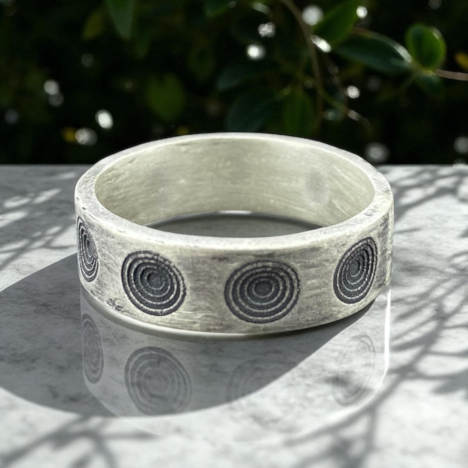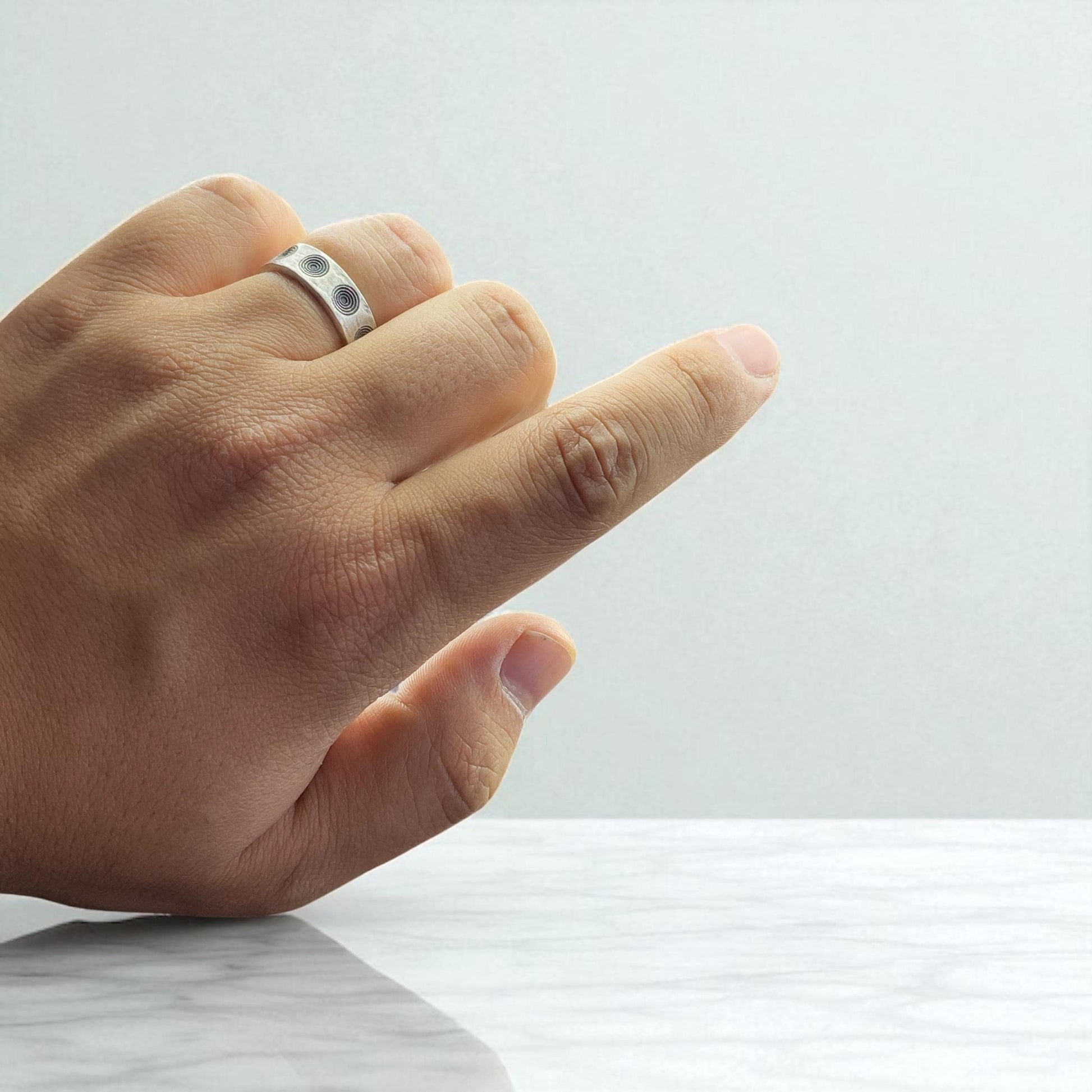 Explore minimalism with a twist in this handcrafted sterling silver ring by Cousinjewellry. Designed with abstract spiral engravings that repeat across a matte surface, this modern ring exudes sophistication. Ideal for men who appreciate unique geometric patterns and subtle statement jewelry.