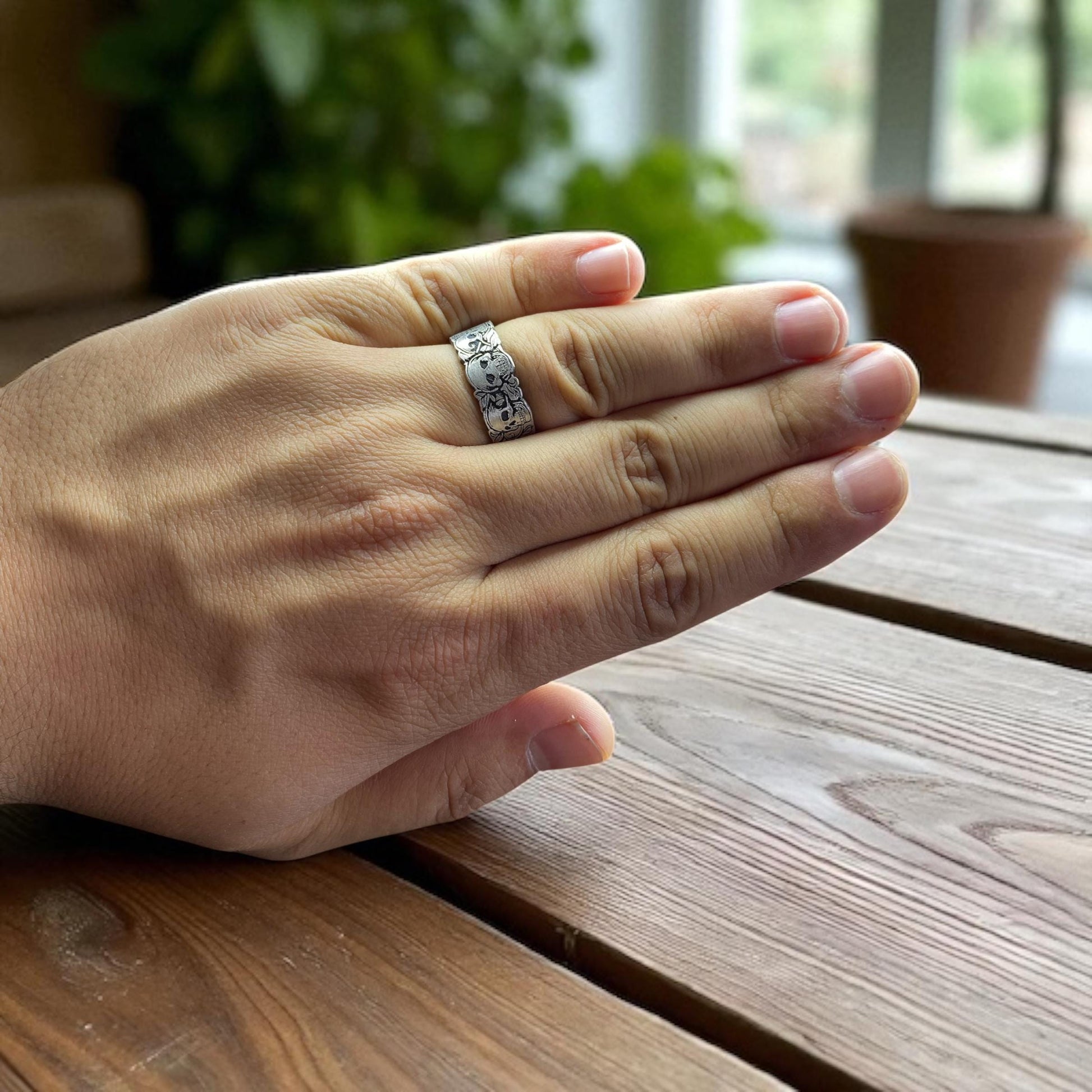 This handmade sterling silver ring features an intricately carved skull motif encircling the band, inspired by gothic and biker aesthetics. The oxidized finish enhances the depth of each skull and the textured background, delivering a bold and rebellious character. With its solid form and rugged edge cuts, this artisan ring is perfect for those who embrace individuality, strength, and a fearless spirit. Crafted by cousinjewellry, this statement piece fuses dark symbolism with durable craftsmanship.