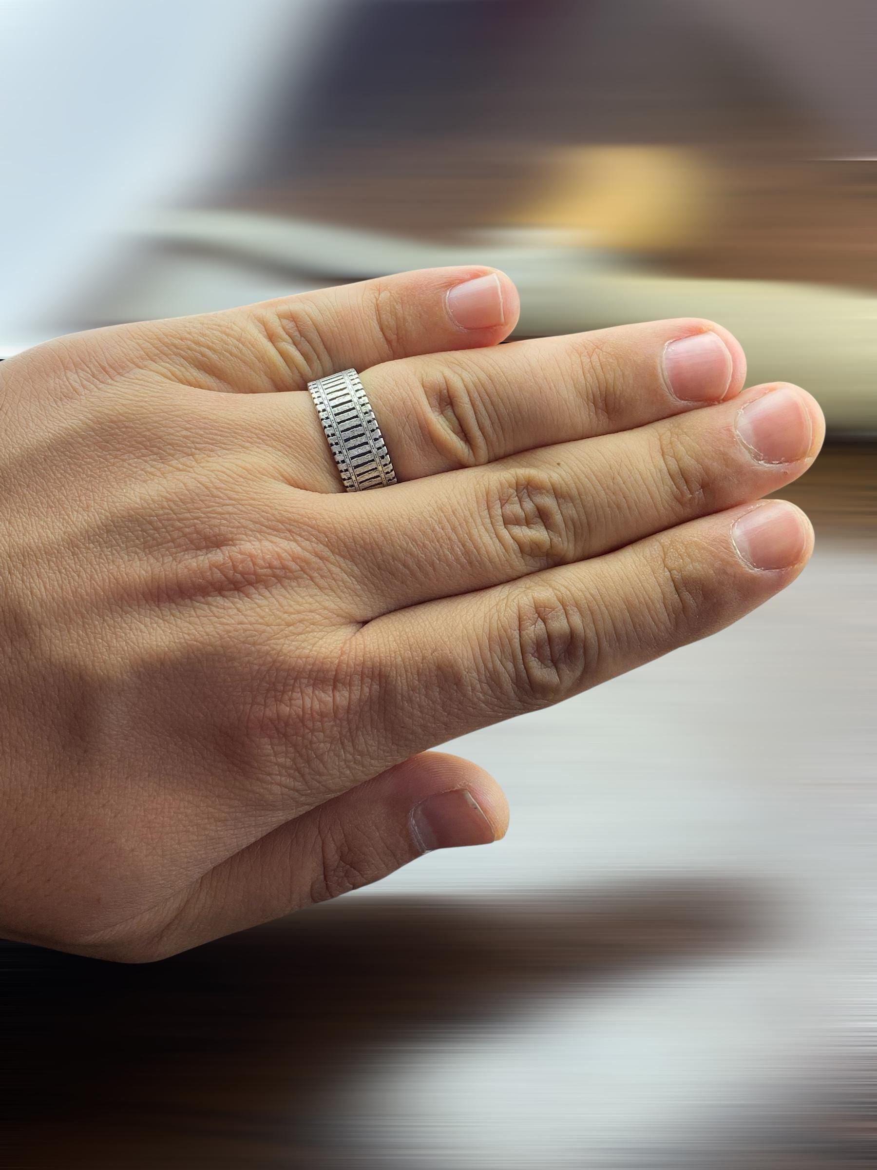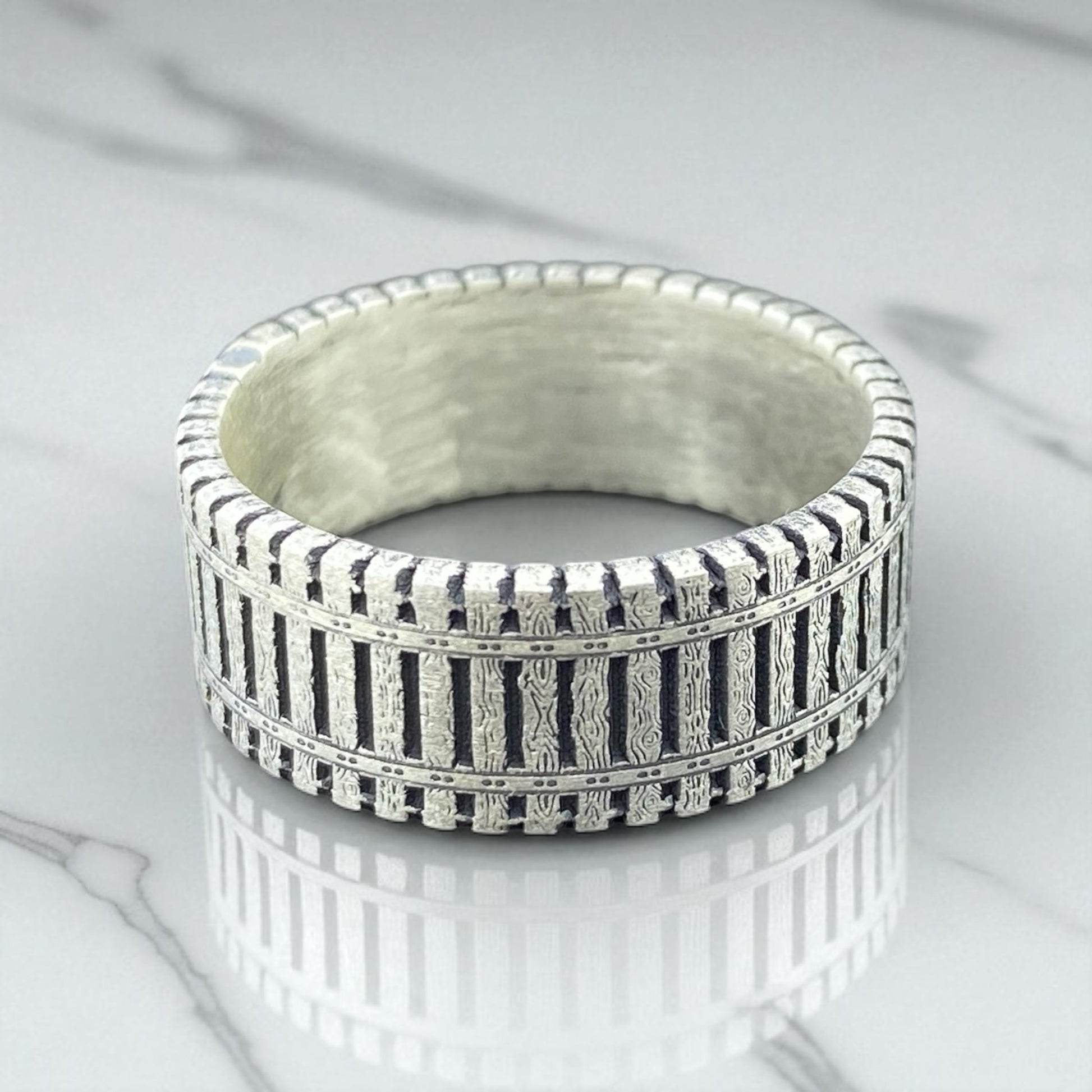 This handcrafted sterling silver ring features a bold and architectural vertical line texture, giving it a strong, masculine presence. The design blends a modern industrial look with rustic charm, making it an ideal statement piece for men who value originality and craftsmanship.